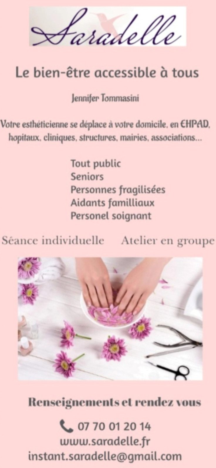 Je m'appelle Jennifer Tommasini, aide-soignante et esthéticienne depuis 2017. Fondatrice de Saradelle Bien-Être, j'accompagne les personnes fragilisées, âgées, convalescentes, aidant familiaux, le personnel soigant et tout public souhaitant prendre soin de soi. Passionée par le bien-être, et la socio-esthétique, je propose des soins esthétiques adaptés, des massages, ainsi que des ateliers collectifs, aussi bien à domicile qu'en structures. Mon objectif : rendre le bien-être accessible à tous, avec douceur et bienveillance.
